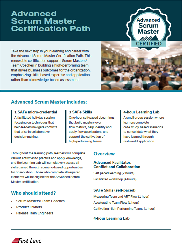 Expand your Scrum Master expertise with the SAFe® Advanced Scrum Master training path (certification).
